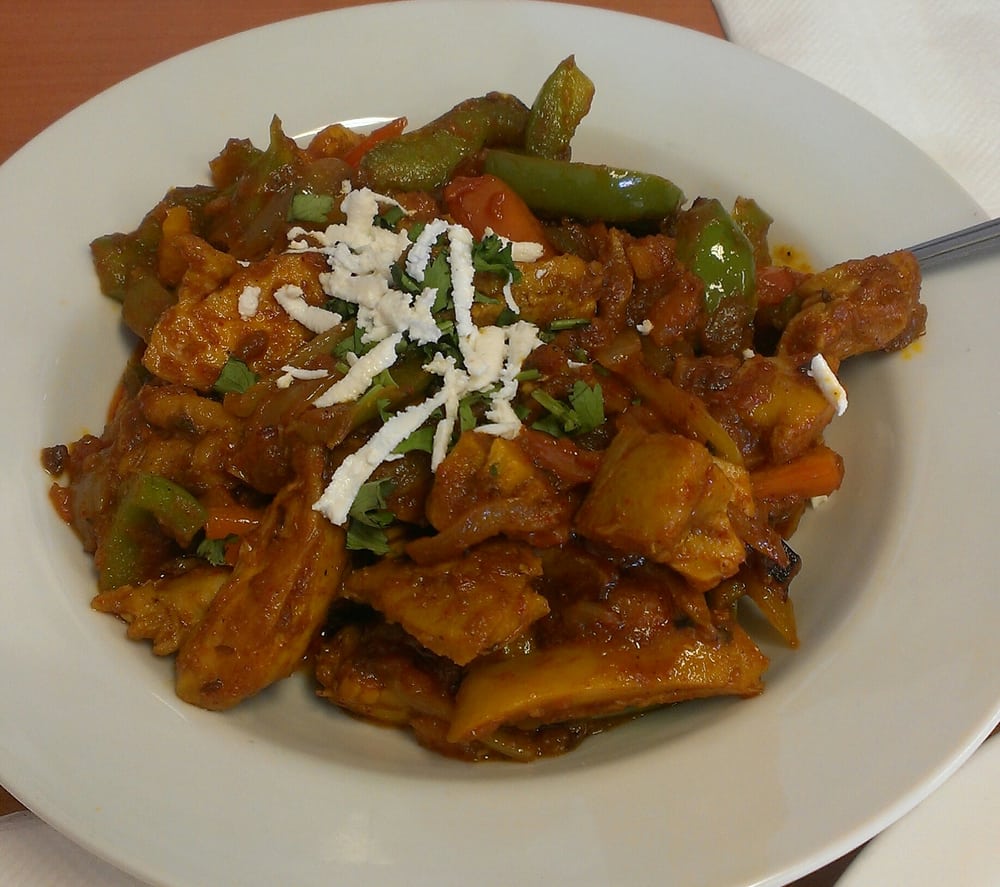 Cubed pieces of cottage cheese that are coated in batter, baked in a tandoor, and then sauted with onions, bell peppers and a variety of sauces.